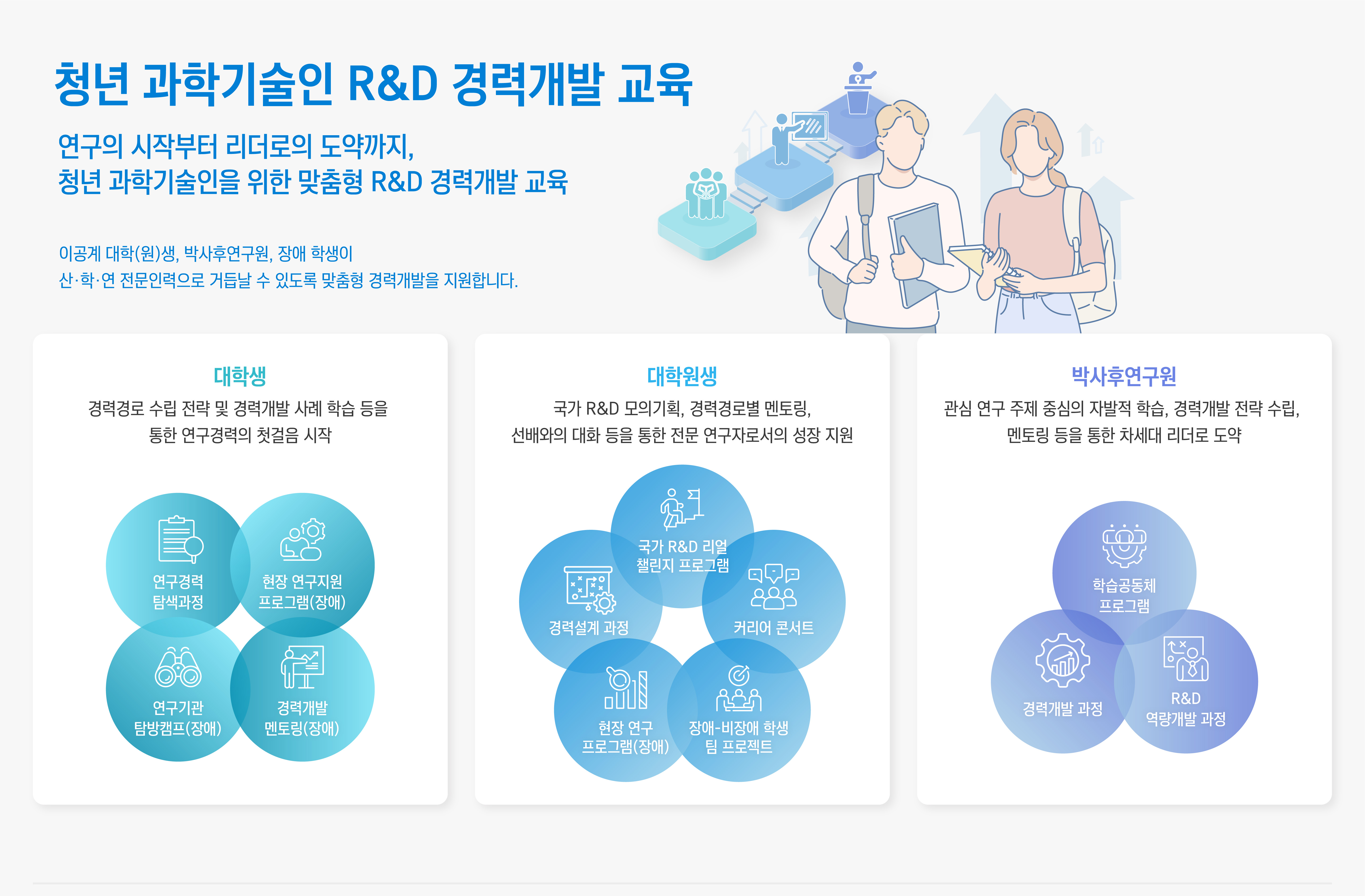 청년 과학기술인 R&D 경력개발 교육 안내 - 연구의 시작부터 리더로의 도약까지, 청년 과학기술인을 위한 맞춤형 R&D 경력개발 교육 / 이공계 대학(원)생, 박사후연구원, 장애 학생이 산.학.연 전문인력으로 거듭날 수 있도록 맞춤형 경력개발을 지원합니다.※ 이미지를 클릭하시면 크게 보실 수 있습니다.