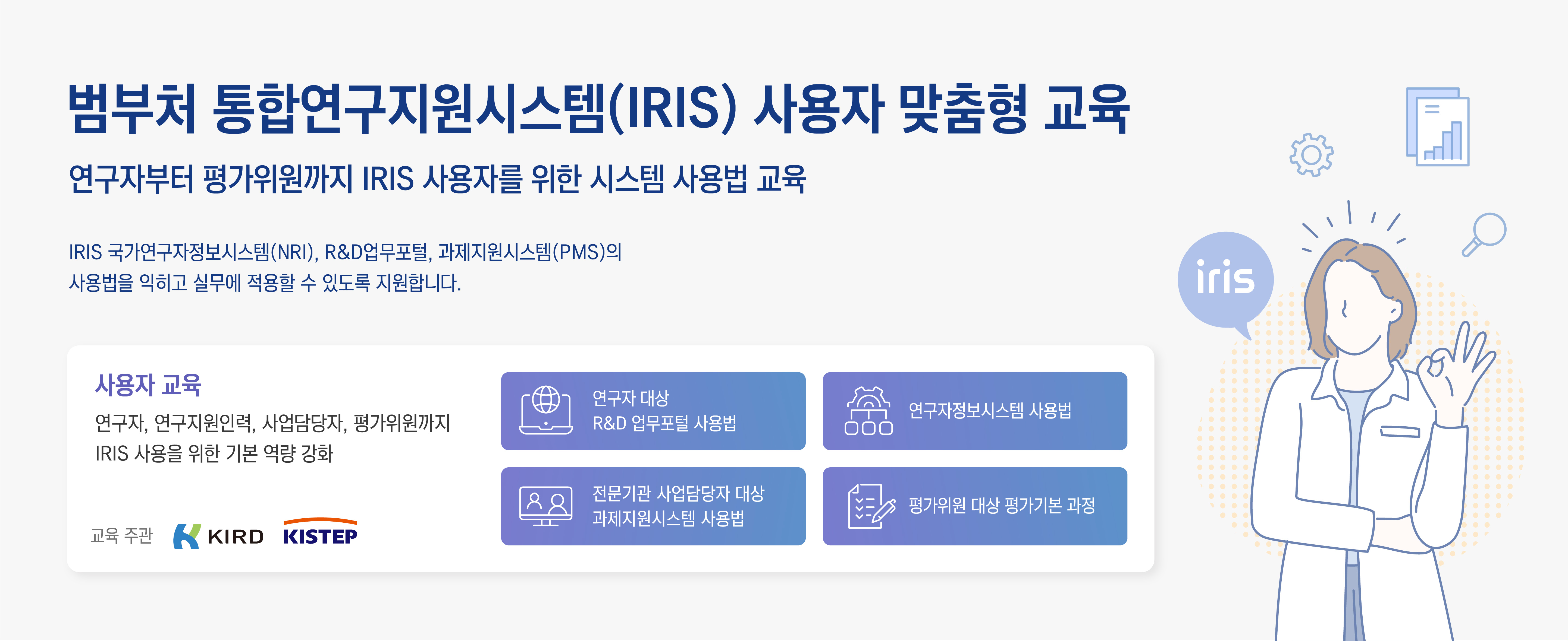 범부처 통합연구지원시스템(IRIS) 사용자 맞춤형 교육 안내 - 연구자부터 평가위원까지 IRIS 사용자를 위한 시스템 사용법 교육 / IRIS 국가연구자정보시스템(NRI), R&D업무포털, 과제지원시스템(PMS)의 사용법을 익히고 실무에 적용할 수 있도록 지원합니다.※ 이미지를 클릭하시면 크게 보실 수 있습니다.