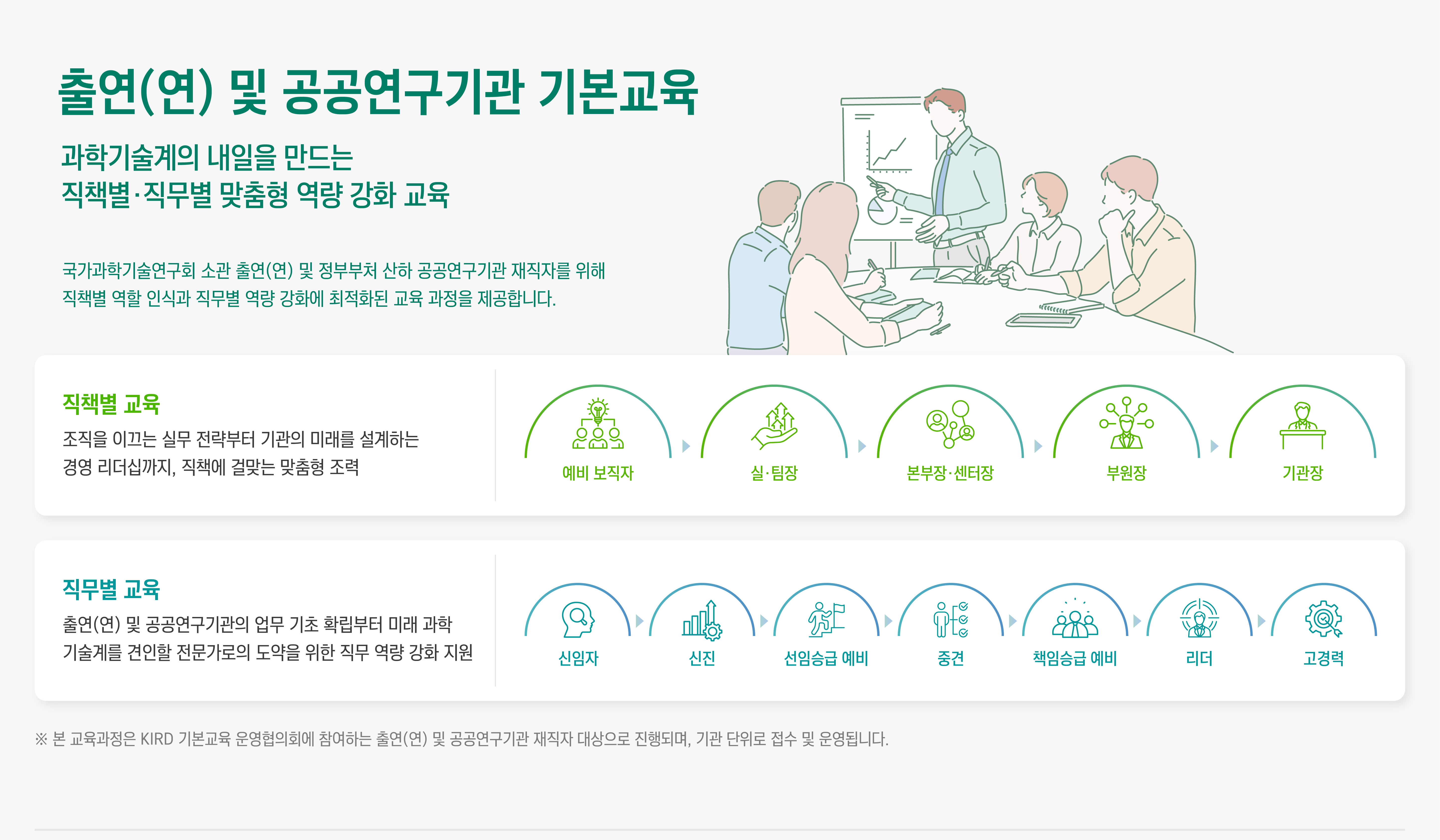 출연(연) 및 공공연구기관 기본교육 안내 - 과학기술계의 내일을 만드는 직책별.직무별 맞춤형 역량 강화 교육 / 국가과학기술연구회 소관 출연(연) 및 정부부처 산하 공공연구기관 재직자를 위해 직책별 역할 인식과 직무별 역량 강화에 최적화된 교육 과정을 제공합니다.※ 이미지를 클릭하시면 크게 보실 수 있습니다.