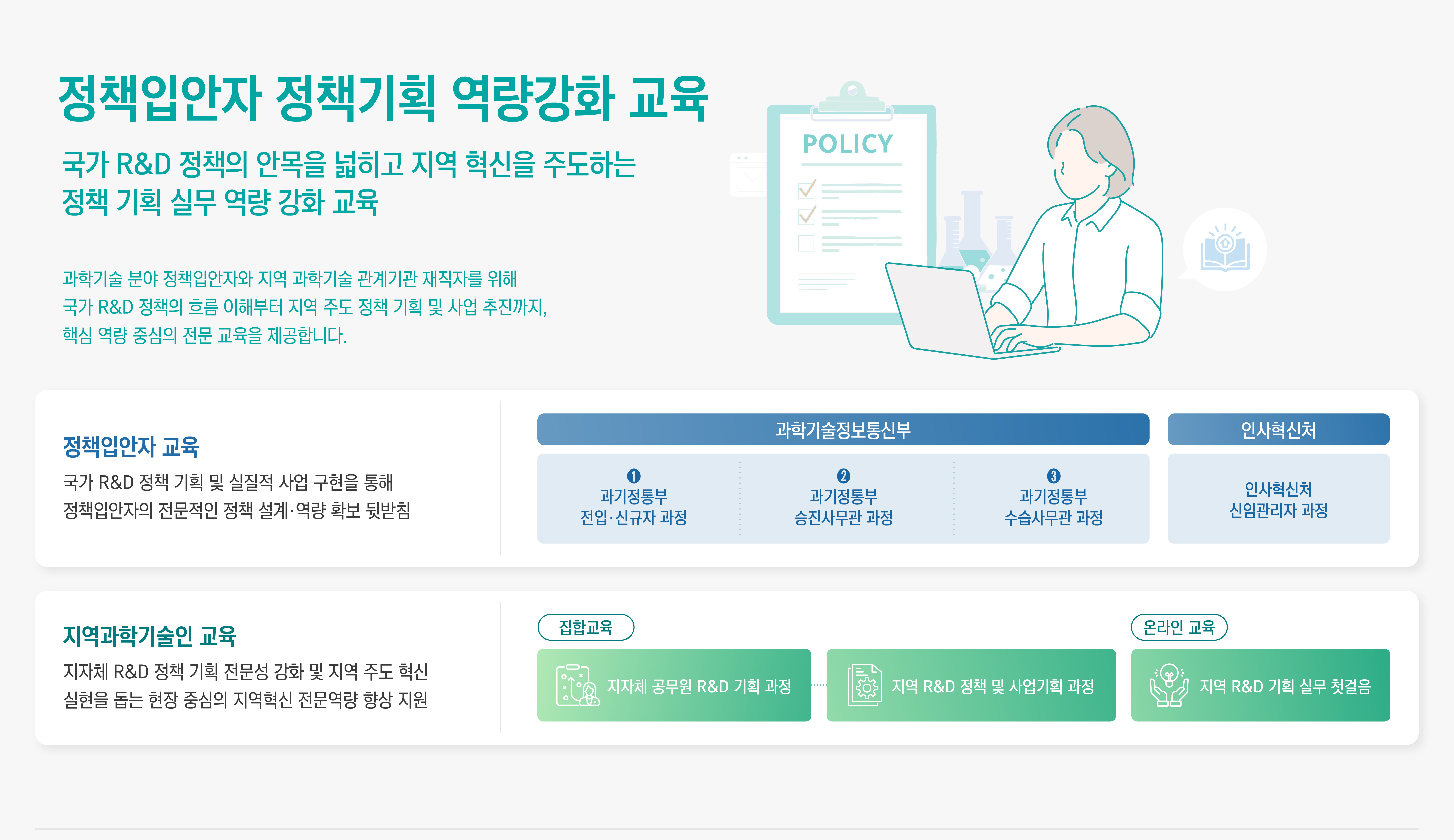 정책입안자 정책기획 역량강화 교육 안내 - 국가 R&D 정책의 안목을 넓히고 지역 혁신을 주도하는 정책 기획 실무 역량 강화 교육 / 과학기술 분야 정책입안자의 지역 과학기술 관계기관 재직자를 위해 국가 R&D 정책의 흐름 이해부터 지역 주도 정책 기획 및 사업 추진까지, 핵심 역량 중심의 전문 교육을 제공합니다.※ 이미지를 클릭하시면 크게 보실 수 있습니다.