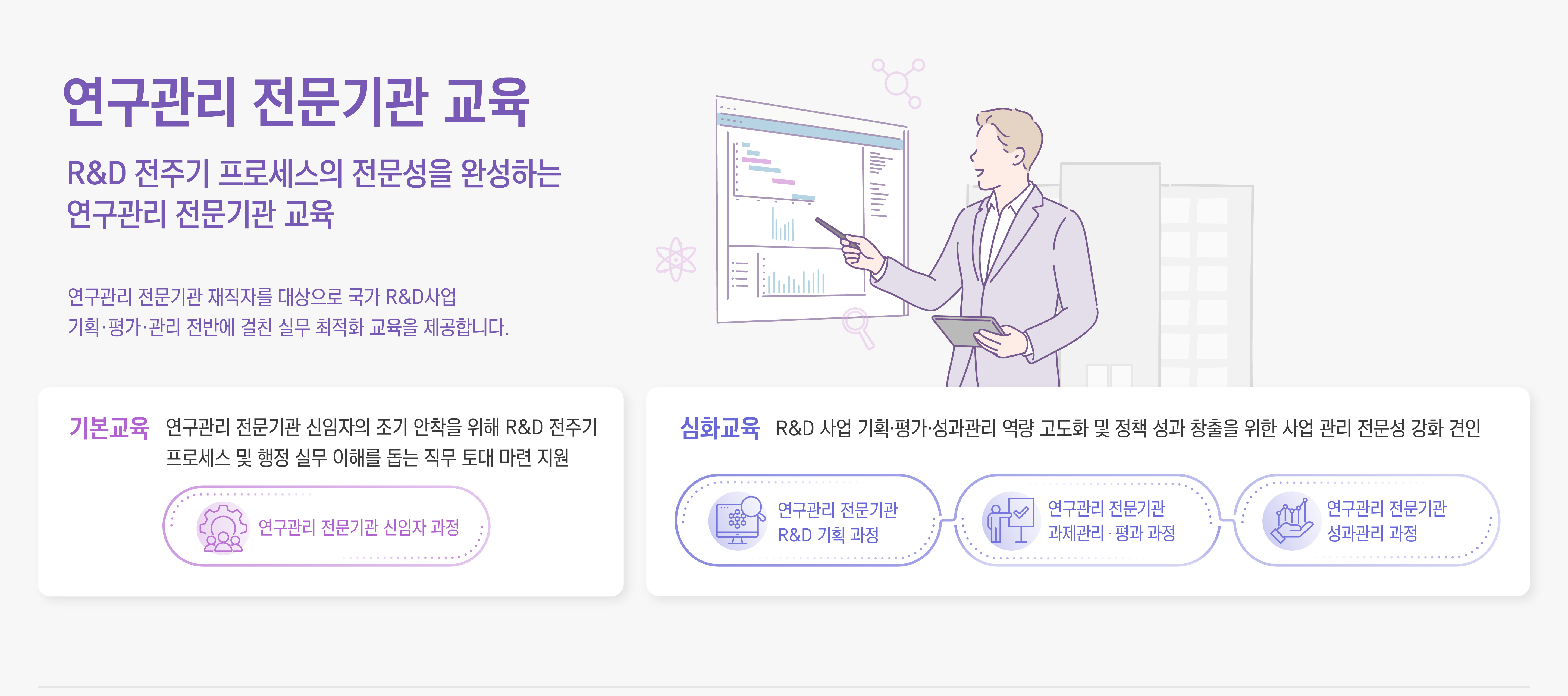 연구관리 전문기관 교육 안내 - R&D 전주기 프로세스의 전문성을 완성하는 연구관리 전문기관 교육 / 연구관리 전문기관 재직자를 대상으로 국가 R&D사업 기획.평가.관리 전반에 걸친 실무 최적화 교육을 제공합니다.※ 이미지를 클릭하시면 크게 보실 수 있습니다.