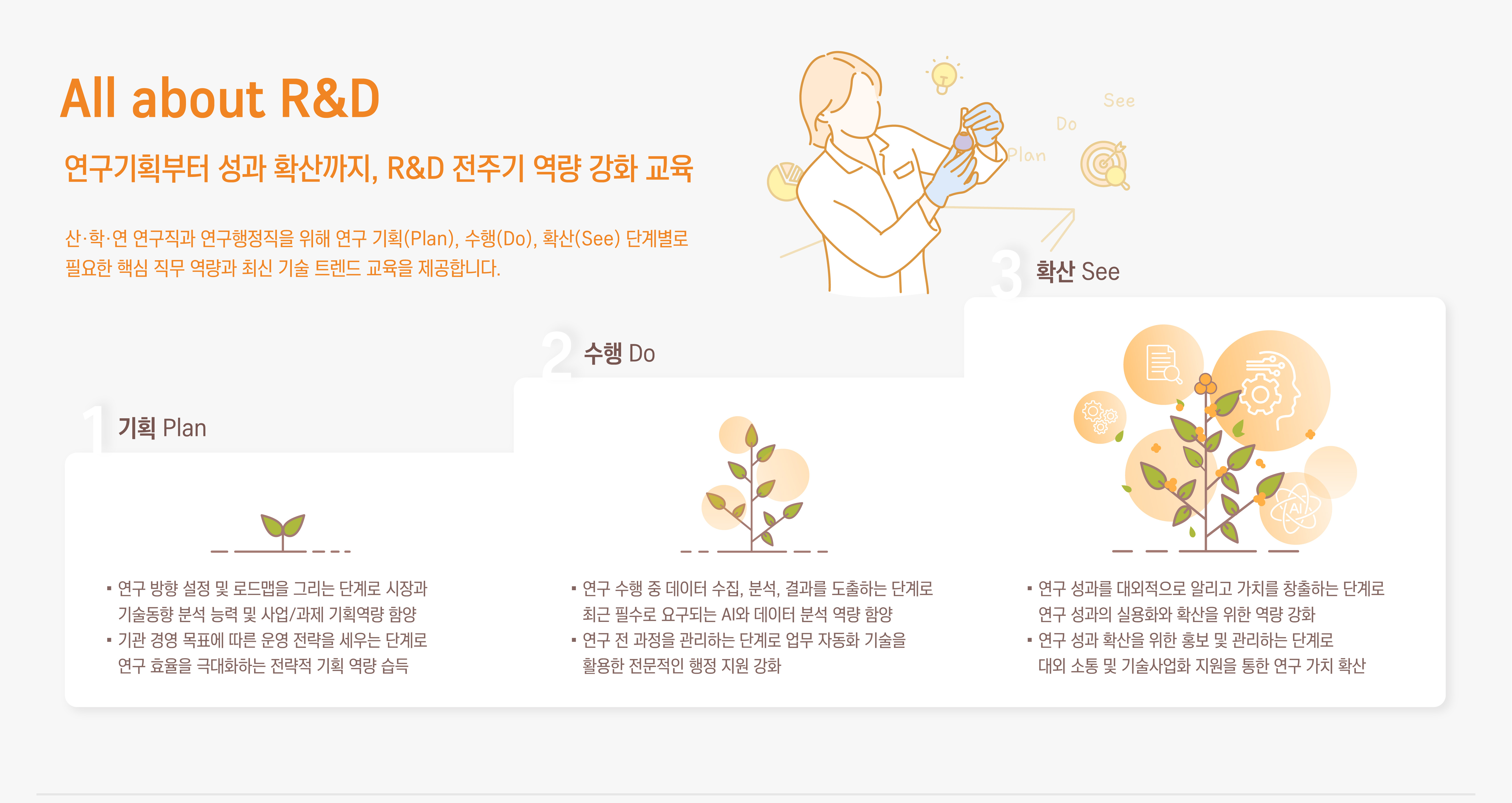 All about R&D 안내 - 연구기획부터 성과 확산까지, R&D 전주기 역량 강화 교육 / 산.학.연 연구직과 연구행정직을 위해 연구 기획(Plan), 수행(Do), 확산(See) 단계별로 필요한 핵심 직무 역량과 최신 기술 트렌드 교육을 제공합니다.※ 이미지를 클릭하시면 크게 보실 수 있습니다.