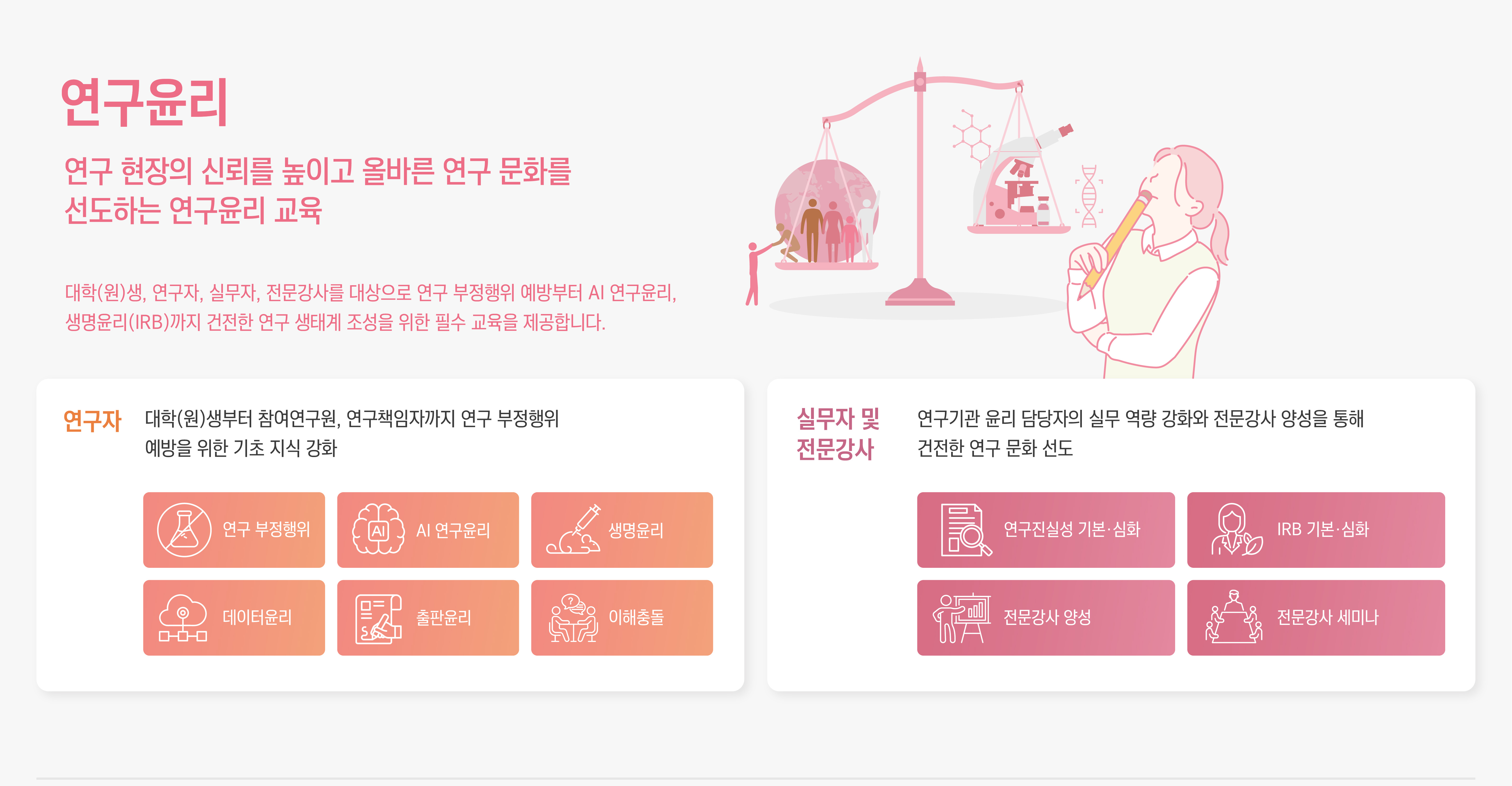연구윤리 안내 - 연구 현장의 신뢰를 높이고 올바른 연구 문화를 선도하는 연구윤리 교육 / 대학(원)생, 연구자, 실무자, 전문강사를 대상으로 연구 부정행위 예방부터 AI 연구윤리, 생명윤리(IRB)까지 건전한 연구 생태계 조성을 위한 필수 교육을 제공합니다.※ 이미지를 클릭하시면 크게 보실 수 있습니다.