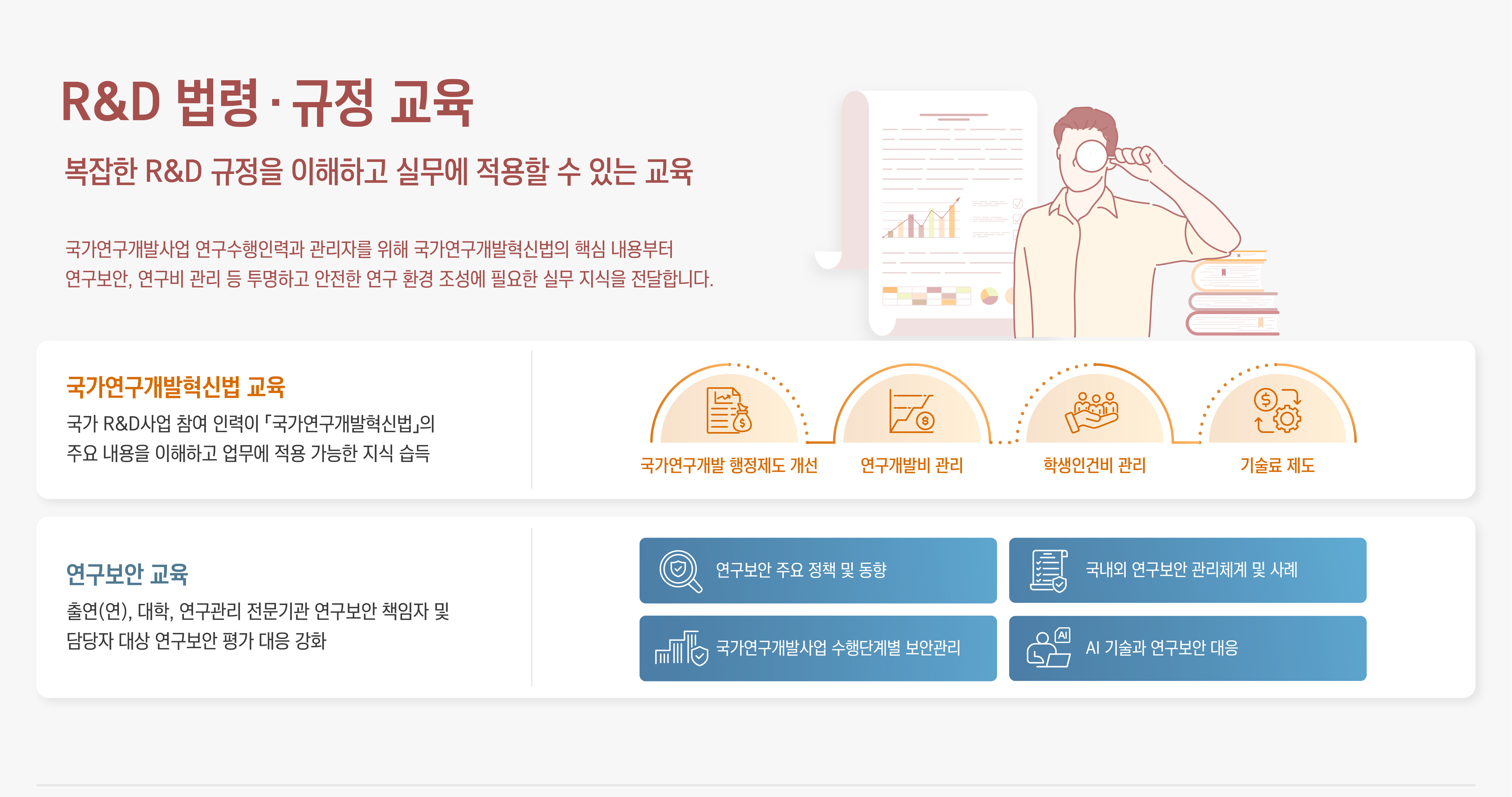 R&D 법령.규정 교육 안내 - 복잡한 R&D 규정을 이해하고 실무에 적용할 수 있는 교육 / 국가연구개발사업 연구수행인력과 관리자를 위해 국가연구개발혁신법의 핵심 내용부터 연구보안, 연구비 관리 등 투명하고 안전한 연구 환경 조성에 필요한 실무 지식을 전달합니다.※ 이미지를 클릭하시면 크게 보실 수 있습니다.