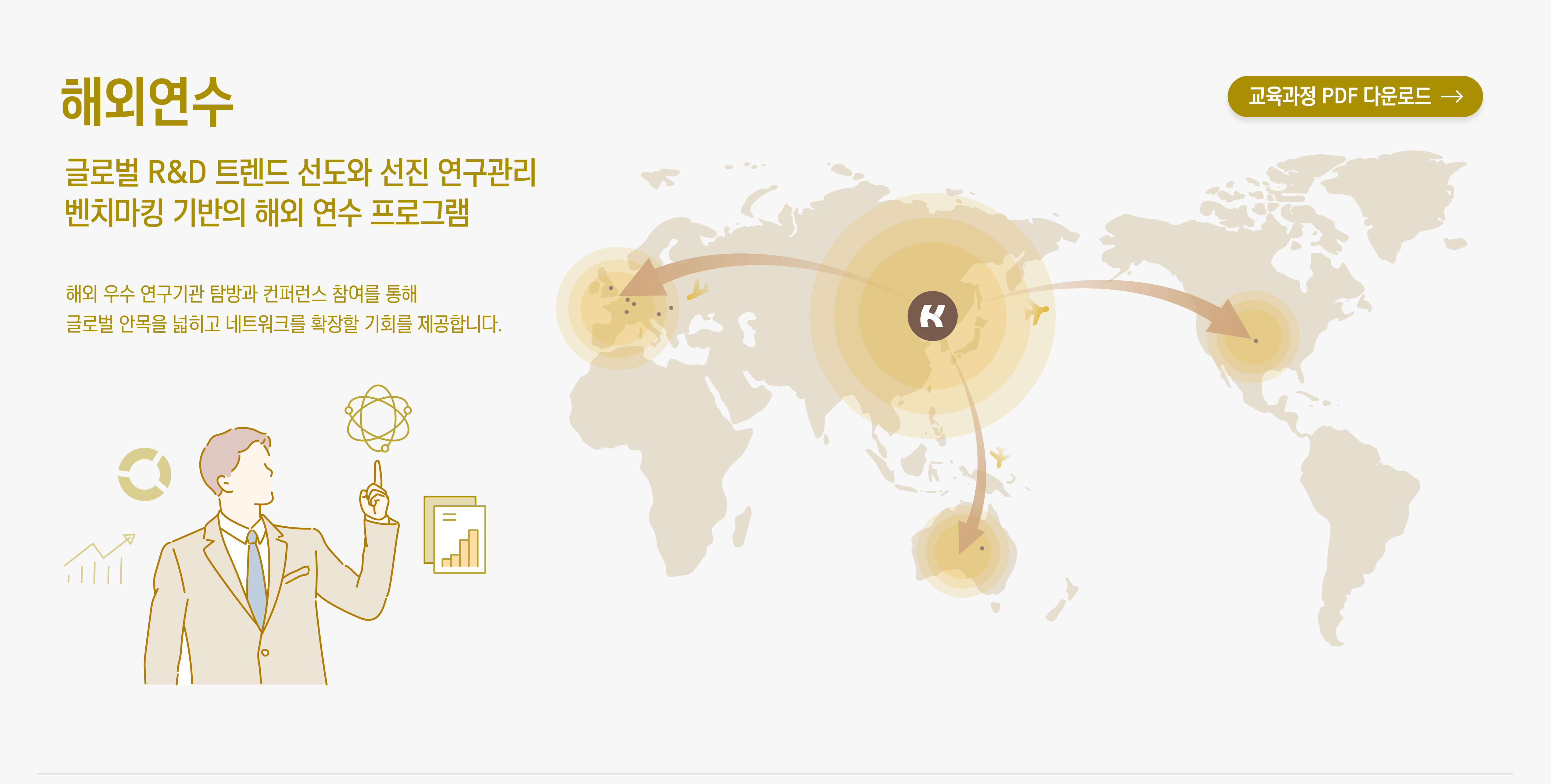 해외연수 안내 - 글로벌 R&D 트렌드 선도와 선진 연구관리 벤치마킹 기반의 해외 연수 프로그램 / 해외 우수 연구기관 탐방과 컨퍼런스 참여을 통해 글로벌 안목을 넓히고 네트워크를 확장할 기회를 제공합니다.※ 이미지를 클릭하시면 크게 보실 수 있습니다.