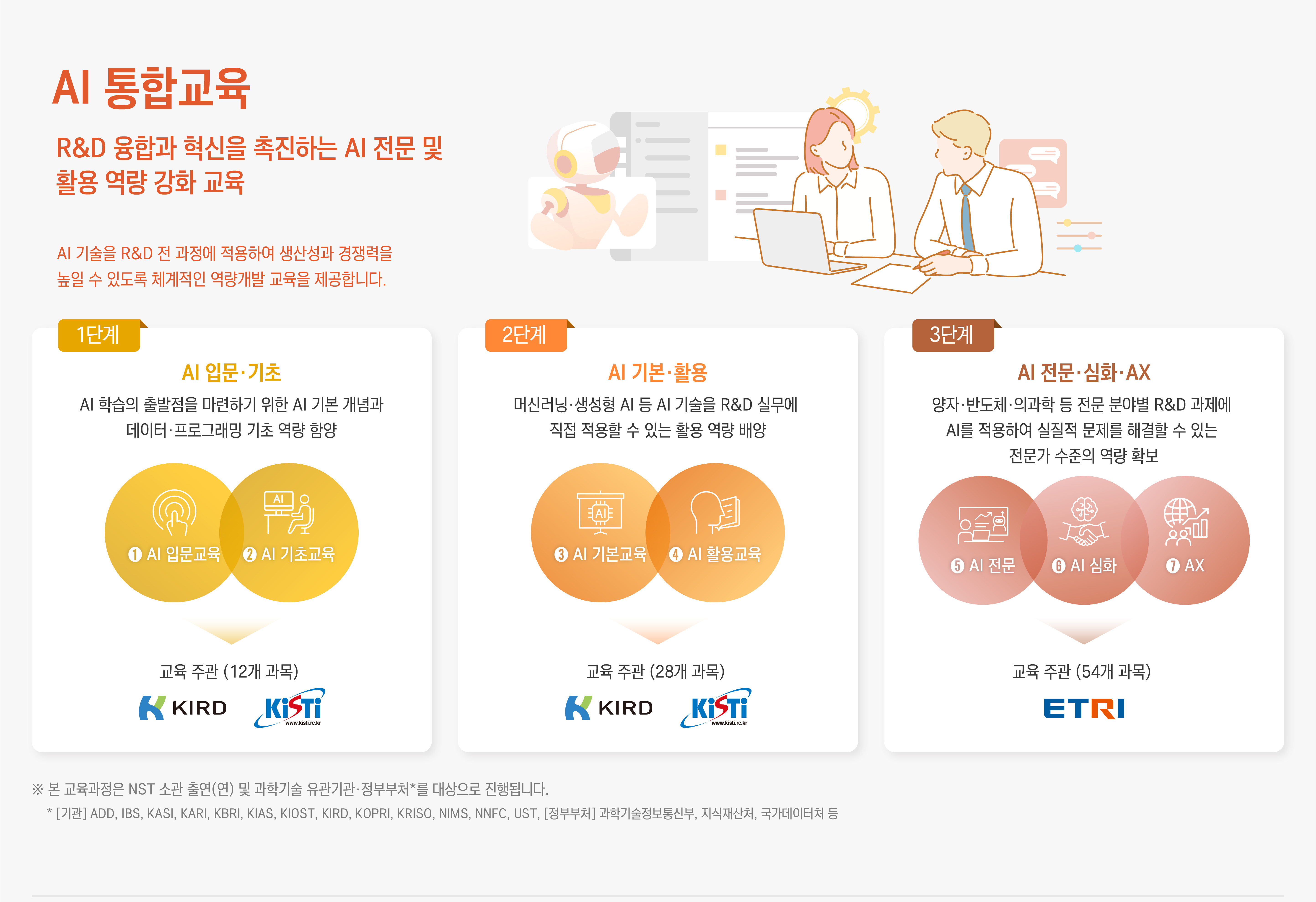 AI 통합교육 안내 - R&D 융합과 혁신을 촉진하는 AI 전문 및 활용 역량 강화 교육 / AI 기술을 R&D 전 과정에 적용하여 생산성과 경쟁력을 높일 수 있도록 체계적인 역량개발 교육을 제공합니다.※ 이미지를 클릭하시면 크게 보실 수 있습니다.