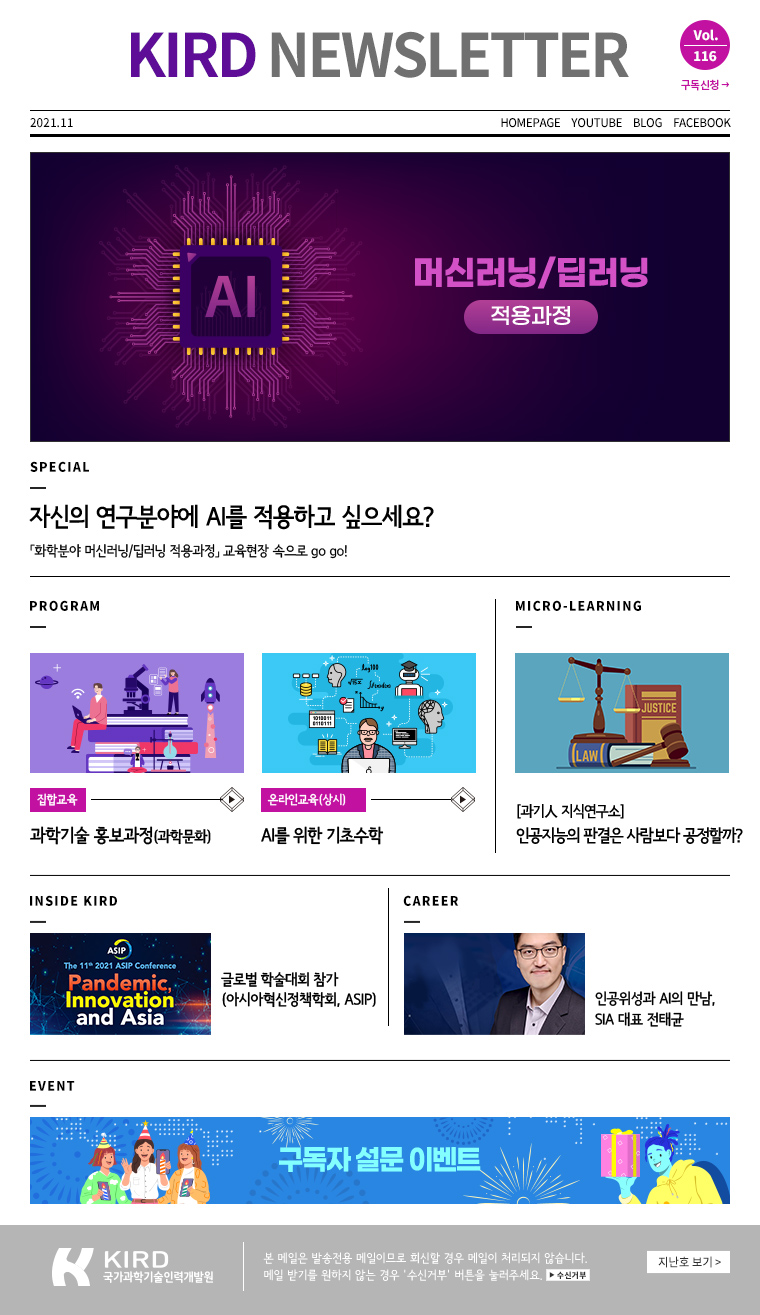 국가과학기술인력개발원 뉴스레터 구독신청 홈페이지 유튜브 블로그 페이스북 SPECIAL PROGRAM PROGRAM Micro-learning INSIDE KIRD CAREER EVENT 구독해지 지난호 보기