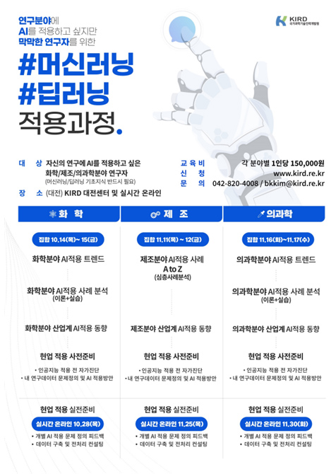 KIRD 대전센터에서 진행되는 이번 교육은 화학(10월 14일~15일), 제조(11월 11일~12일), 의과학(11월 16일~17일) 총 3개 분야로 구성되어 다양한 분야의 연구자들에게 AI 적용에 관한 교육을 제공합니다.