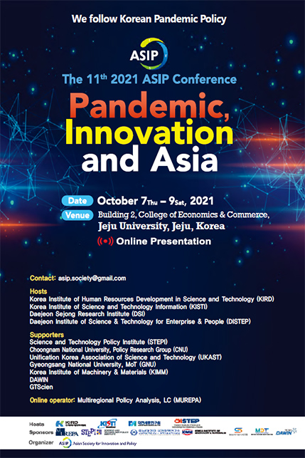 KIRD는 지난 10월 7일부터 9일까지 열린 아시아기술혁신학회(Asian Society for Innovation and Policy, ASIP)에 참가하여 국내·외 전문가들과 과학기술정책 연구 방향을 공유하였습니다. 이번 컨퍼런스의 주제는 ‘Pandemic, Innovation and Asia’로 우리 KIRD는 과학기술정책 특별세션과 신기술·신산업 분야 과학기술 인재양성 전략에 대해 논의하는 라운드테이블을 운영했습니다.